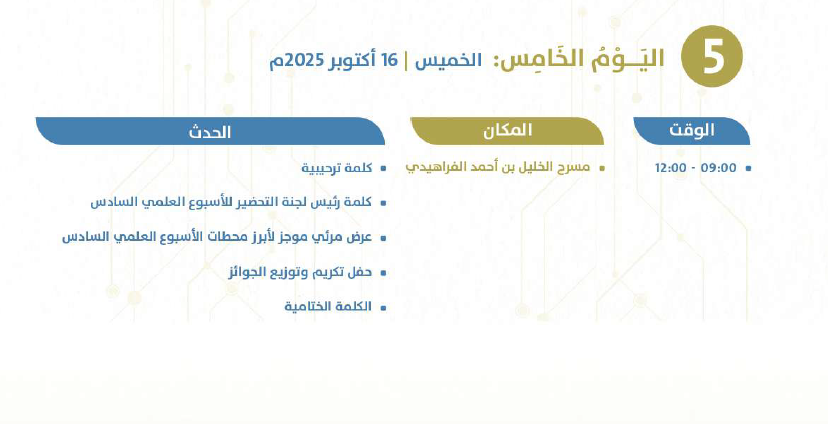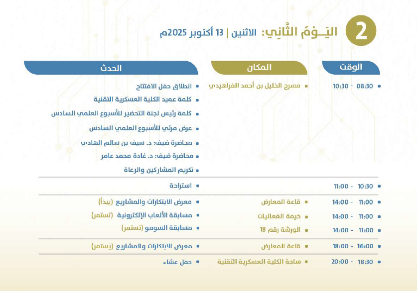 بناءً على نجاح فعاليات الأسبوع العلمي الخامس المميز، تفخر الكلية العسكرية التقنية بالإعلان عن النسخة السادسة، والتي تعود بموضوع جديد ومثير، وأهداف طموحة، ولأول مرة، توسّع نطاق المشاركة ليشمل مشاركين من جميع أنحاء دول مجلس التعاون الخليجي. ويمثل هذا التوسع خطوةً مهمةً في تعزيز التعاون الإقليمي والتبادل العلمي.